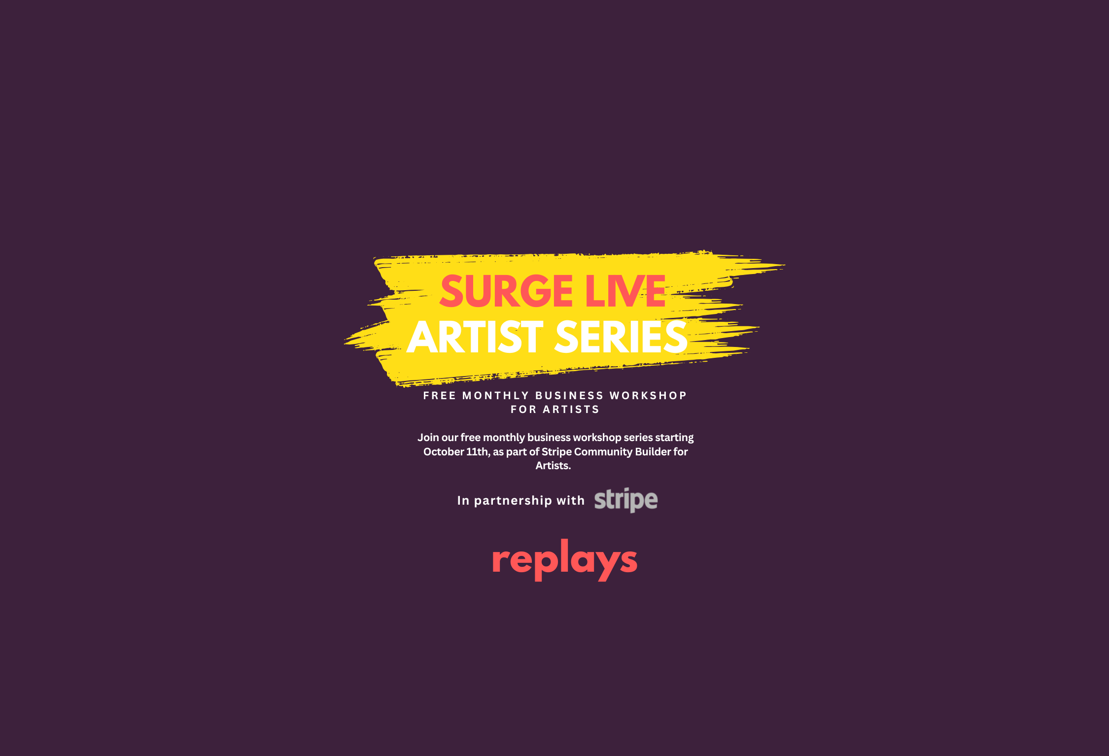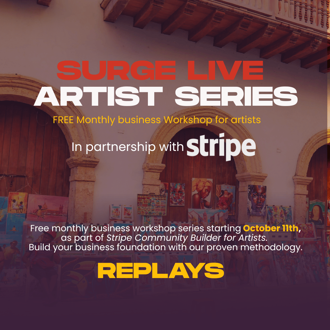 Replays of our free monthly business workshop series starting October 11th, as part of Stripe Community Builder for Artists.